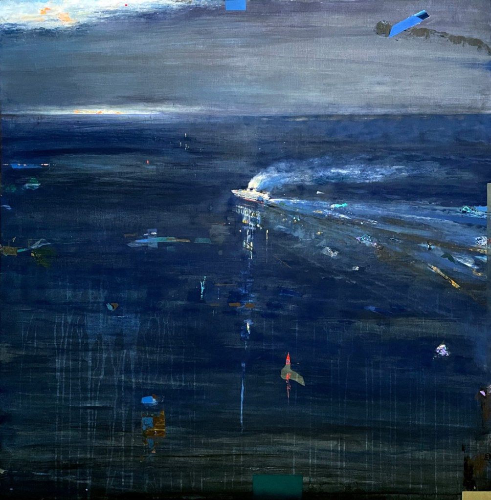 Asimismo, el único elemento humano que hay en el cuadro, un barco de vapor, directamente me lleva al siglo pasado, y me hace preguntar si aquello que estoy viendo se trata quizás de un recuerdo ajeno. Sin embargo, las figuras geométricas y los pegotes de pintura que aparecen desperdigados por la composición se me asemejan a glitches, errores en la memoria de aquel que sostiene el recuerdo. Memoria, relato y olvido están sin duda conectados. Esto me recuerda al breve ensayo que hizo Italo Calvino acerca de la Odisea. Sobre el viaje (sea de ida o de retorno), dice este que “es individualizado, pensado y recordado: el peligro es que caiga en el olvido antes de haber sucedido”. Acerca de la memoria, dice lo siguiente: “sólo cuenta verdaderamente […] si reúne la impronta del pasado y el proyecto del futuro, si permite hacer sin olvidar lo que se quería hacer, devenir sin dejar de ser, ser sin dejar de devenir”[1]. Aquí el recuerdo parece no tener claro ni lo uno ni lo otro, y en su lugar está dejando paso lenta pero inexorablemente al olvido, que parece fundirse e interactuar con el fondo mismo del cuadro, como se puede observar en la estela dejada por el barco, en la que las figuras geométricas parecen no estar superpuestas sino flotando sobre el mar.
