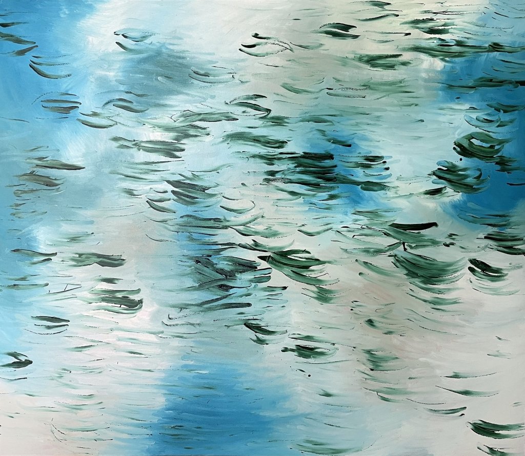 De este cuadro abstracto parece que no haya mucho que decir. Es en apariencia forma sin contenido, y ni siquiera hay título que oriente una posible lectura. Así pues, pudiera ser muchas cosas. El azul nos lleva de manera casi inevitable al agua y/o al cielo. Junto al blanco, pudiera ser un día nublado o un lago reflejando la luz. Si imaginamos que estamos tumbados y el cuadro es justo lo que tenemos encima, pudiéramos ver perfectamente aquello primero que he dicho, y los trazos verdes bien pudieran ser hojas movidas por un viento de rápidas y finas líneas grises o una bandada de pájaros surcando el cielo a toda velocidad. Si imaginamos, por el contrario, que el cuadro lo tenemos a nuestros pies, veríamos hojas o nenúfares flotando sobre un agua en calma.